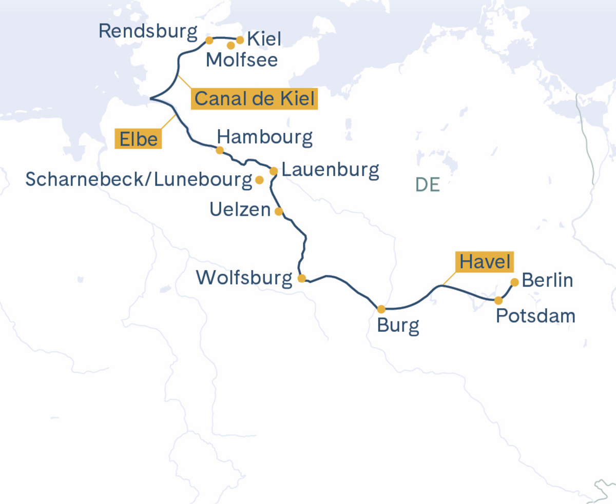 Une croisière sur l'Elbe ou la Havel vous permettra de découvrir le charme de la plaine d'Allemagne du Nord. Partez de Berlin, puis faites connaissance avec Potsdam et le parc prussien de Sanssouci, les lacs de la région de la Havel ou la pittoresque ville de Lunebourg, célèbre pour son sel, lors d'une croisière fluviale en direction de l'Elbe. Découvrez des merveilles techniques telles que l'élévateur à bateaux de Lunebourg et la seule écluse allemande sur l'Elbe à Geesthacht. Hambourg, le canal de la mer du Nord à la mer Baltique, Kiel et la station balnéaire de Laboe avec son imposant monument aux morts de la marine constituent les points d'orgue de cette croisière sur l'Elbe.