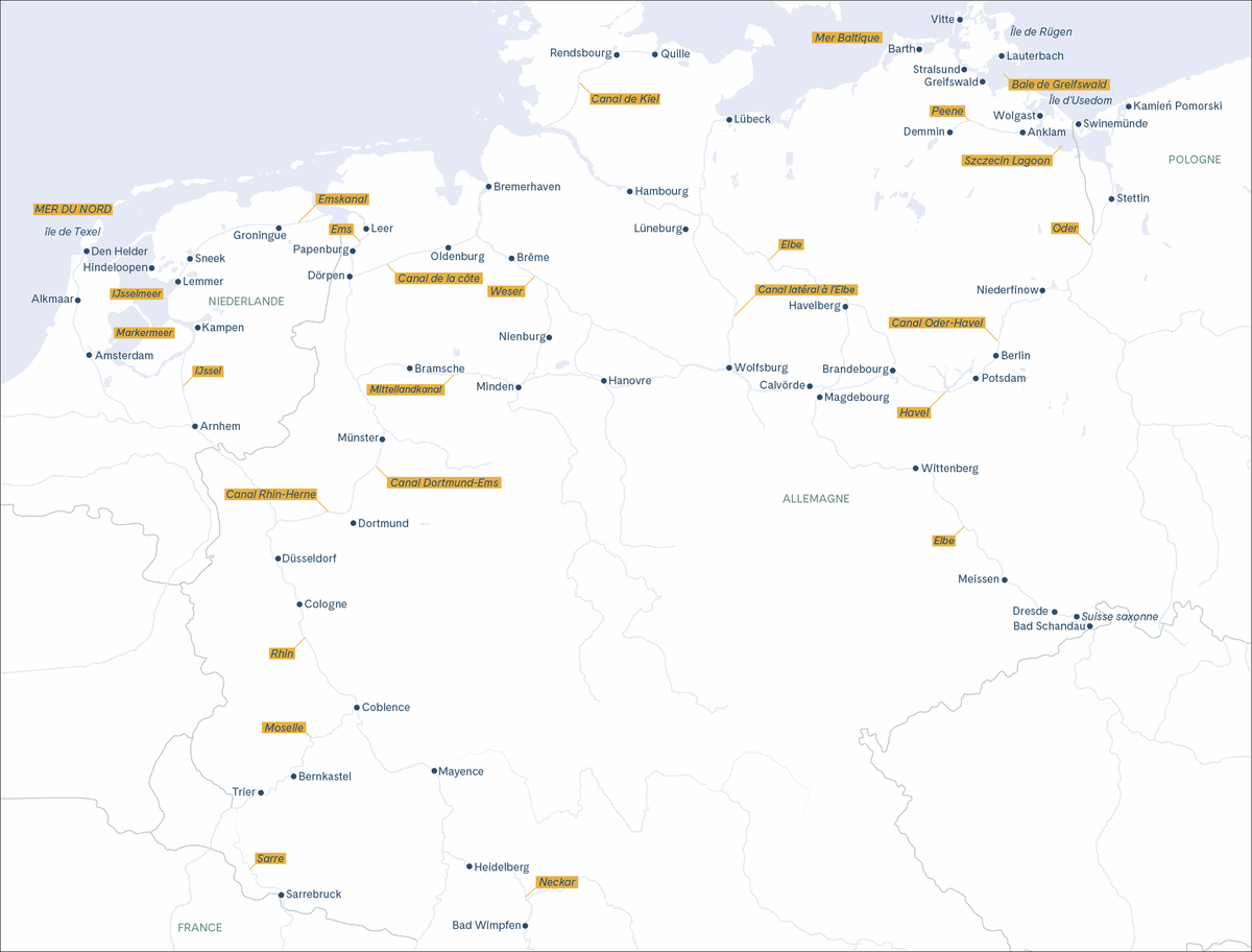 Les voies navigables allemandes offrent un aperçu de la tradition des villes hanséatiques du nord de l'Allemagne. Les croisières fluviales vers la mer Baltique et la mer du Nord dévoilent des régions côtières impressionnantes, des falaises de craie et des stations balnéaires, ainsi que la beauté de la nature lors de voyages fluviaux sur les voies navigables allemandes. Les croisières fluviales vers la mer Baltique et la mer du Nord dévoilent des régions côtières impressionnantes, des falaises de craie et des stations balnéaires, ainsi que la beauté de la nature lors de voyages fluviaux sur l'Elbe, la Weser et la Havel.