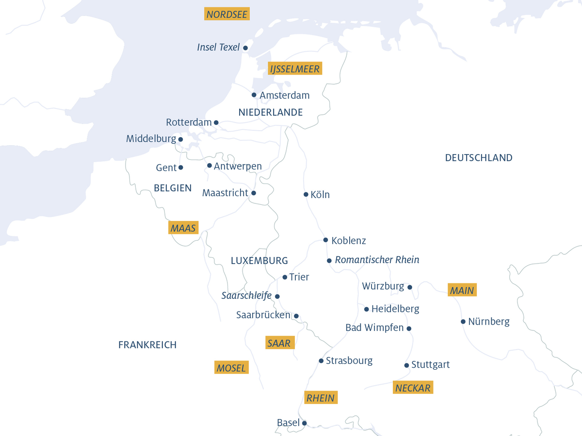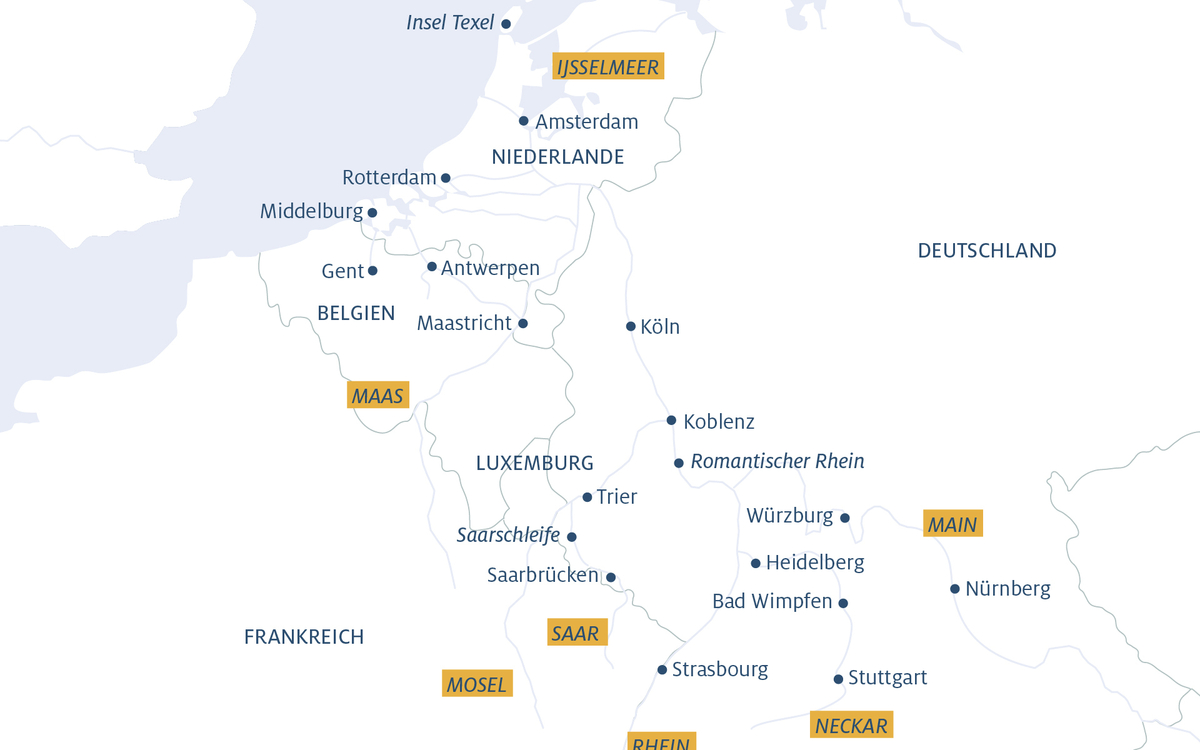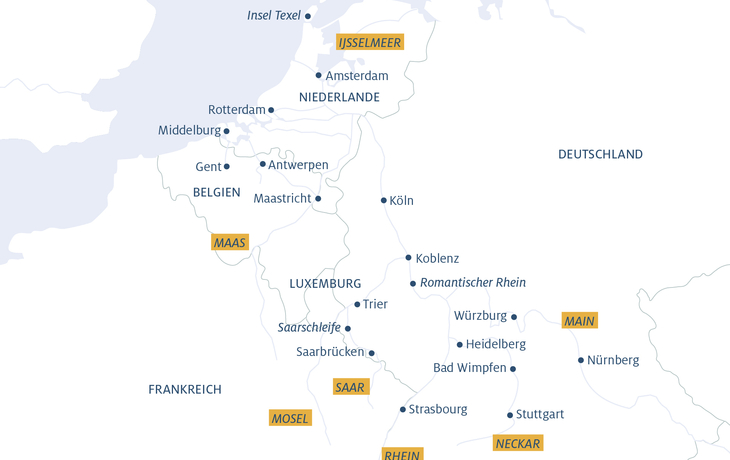 La diversité d'une région unique vous séduira : lors de votre croisière sur le Rhin, d'une croisière fluviale sur la Moselle et le Rhin ou d'un des nombreux voyages en bateau le long des affluents du Rhin, découvrez des paysages enchanteurs pleins de contrastes passionnants et de moments inoubliables. Le Rhin et ses affluents relient plusieurs pays et sont aussi importants que variés sur le plan géographique, historique et culturel. Une nature sauvage propice à la randonnée et aux sports, des vieilles villes pleines de charme et des métropoles modernes, des vignobles et des cérémonies du thé vous attendent dans les offres de voyage de Thurgau Travel. Nos offres de croisières fluviales sur le Rhin comprennent également des particularités telles que des voyages divertissants (dîners policiers) et des voyages saisonniers (Avent, floraison des tulipes).