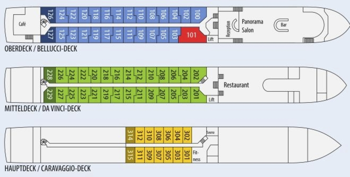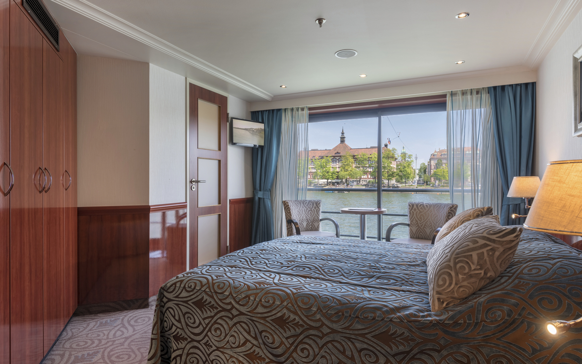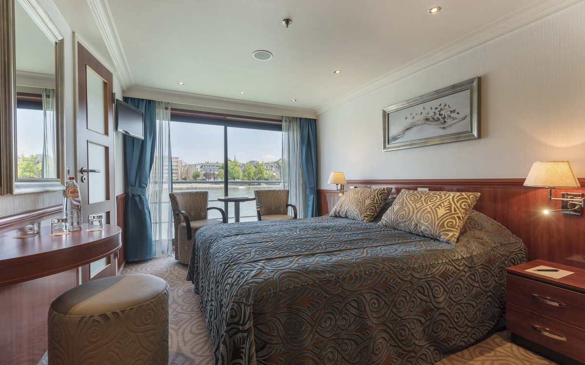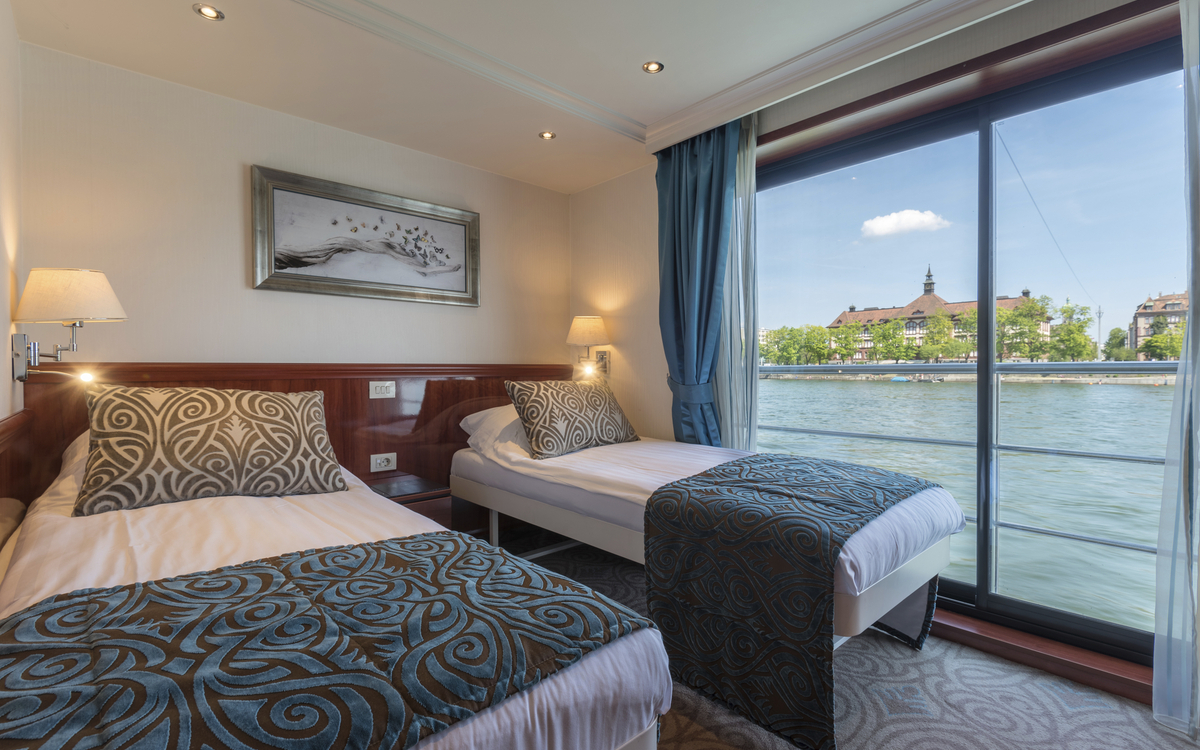 Die ca. 15 m² grossen 2-Bettkabinen des Mittel-, bzw. Oberdecks verfügen über einen französischen Balkon mit raumhohen Glasschiebetüren. In der Kabine gibt es eine Sitzgelegenheit, bestehend aus einem Tisch und zwei Stühlen.