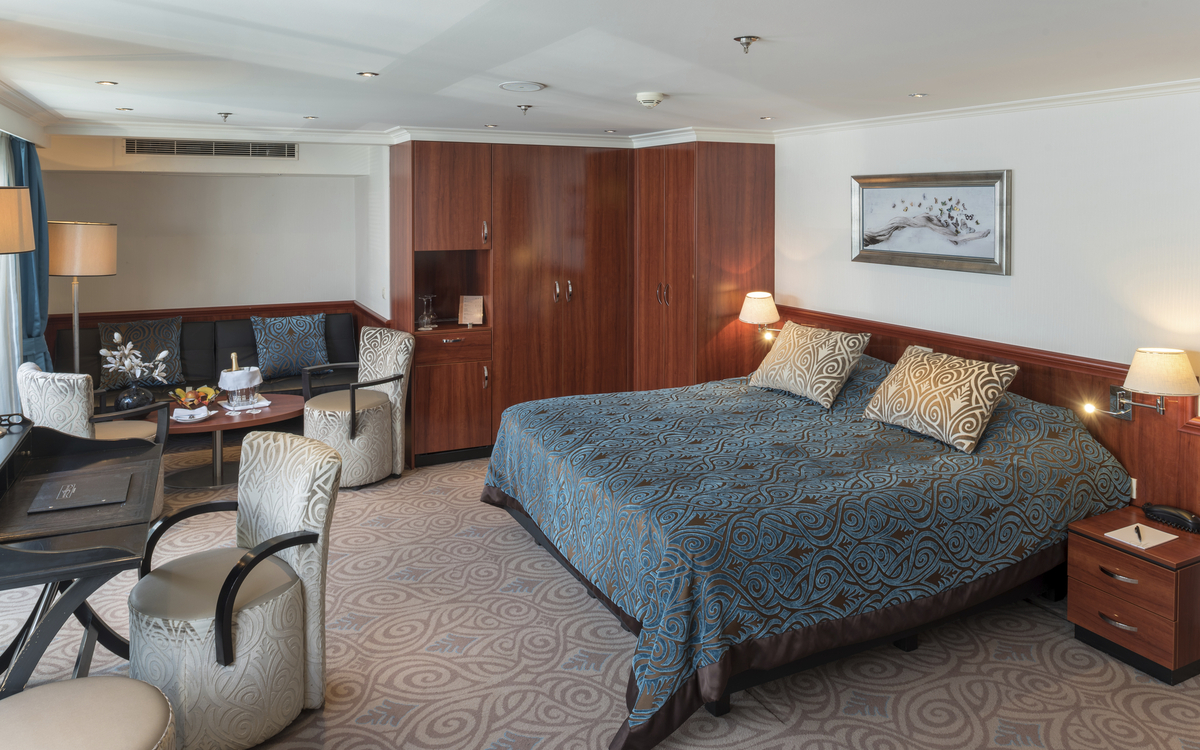 Die Suite im Oberdeck ist gleich ausgestattet wie die übrigen Kabinen des Mittel-/Oberdecks, jedoch beträgt die Grösse ca. 32 m².