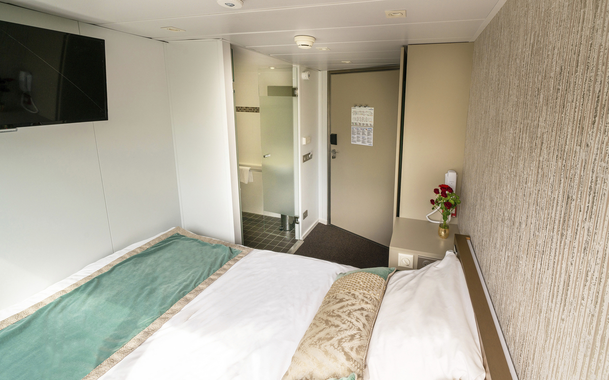 Alle Kabinen sind stilvoll, komfortabel und mit Dusche/WC, Föhn, TV und Safe eingerichtet. Die Kabinen auf dem Hauptdeck (ca. 8 m²) sind mit zwei Einzelbetten und nicht zu öffnenden Fenstern, die Oberdeckkabine (ca. 11 m²) mit einem Doppelbett (nicht freistehend) und Fenster zum Öffnen ausgestattet.