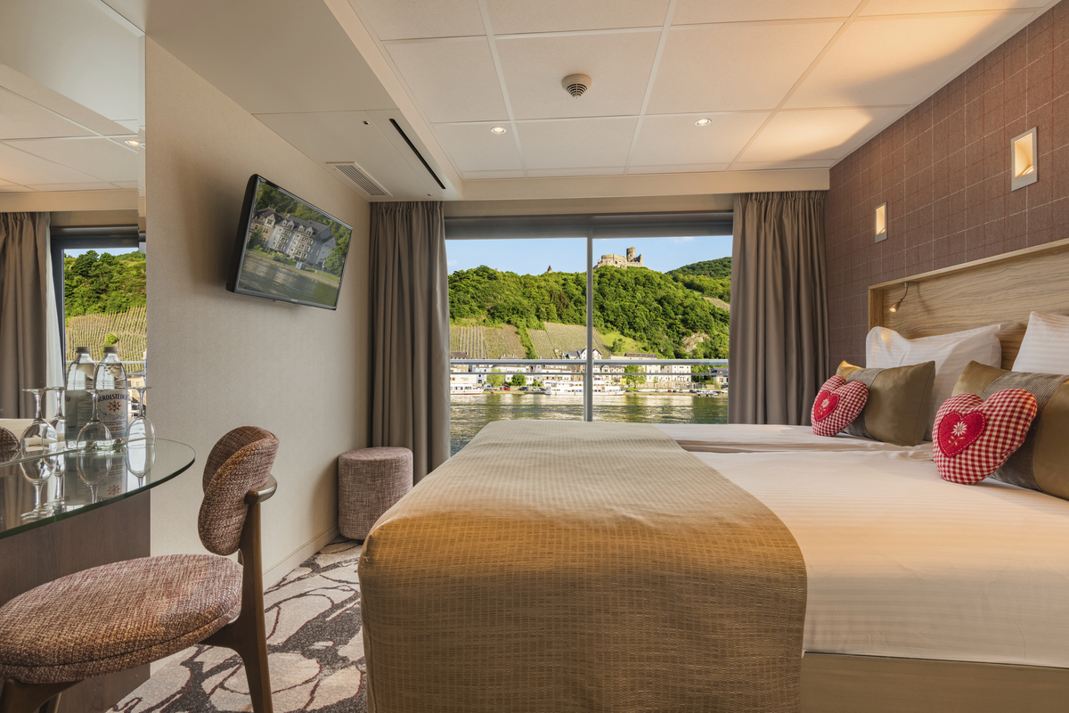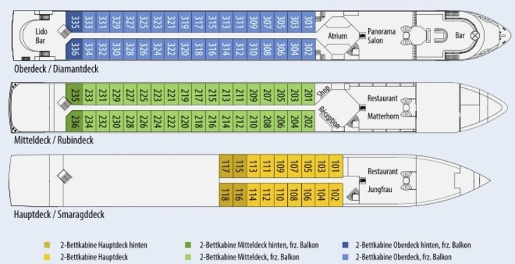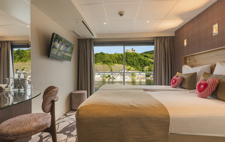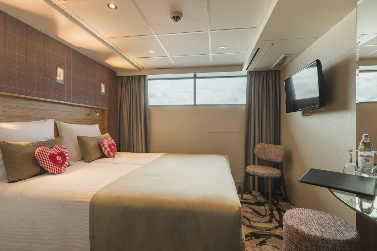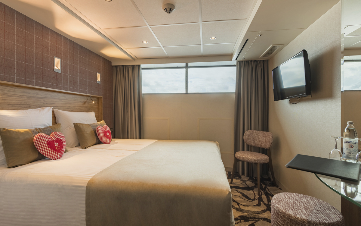 Alle Kabinen liegen aussen, sind komfortabel und luxuriös eingerichtet. Auf dem Ober- und Mitteldeck mit französischem Balkon (Glasschiebetüren), auf dem Hauptdeck sind die kleineren Fenster aus Sicherheitsgründen nicht zu öffnen.