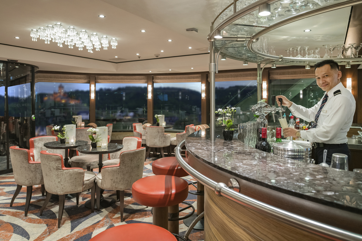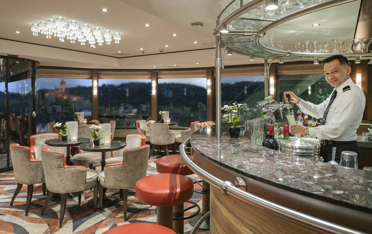 Stilvoll eingerichteter Panorama-Salon und Bar (die Bar befindet sich auf einem Zwischendeck zwischen Ober- und Mitteldeck) und Lido-Bar mit Aussenterrasse auf dem Oberdeck hinten. Gratis WLAN nach Verfügbarkeit. Grossflächiges, teilweise überdachtes Sonnendeck mit kleinem Pool, Liegestühlen und Sitzgruppen und Putting Green. Das Haupt-, Mittel- und Oberdeck sind mittels Lift verbunden