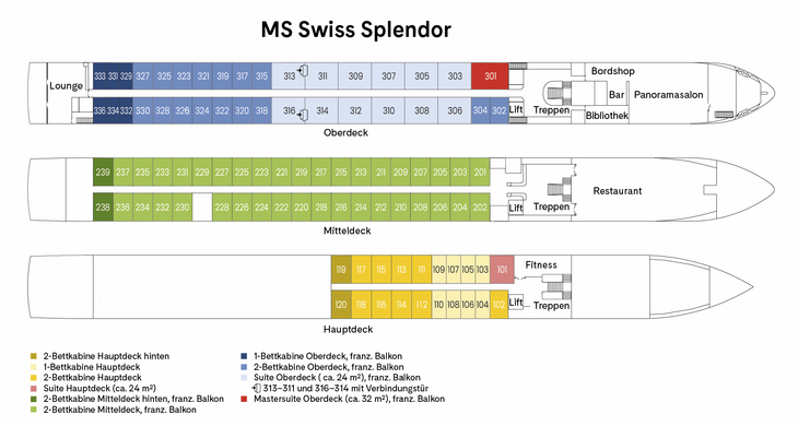Die Schweizer Reederei Scylla hat die Swiss Splendor im 2023 übernommen und im Folgejahr umfangreich renoviert. Das Schiff zeichnet sich durch die modernen Elemente sowie die hohe Anzahl an Einzelkabinen und Suiten aus.