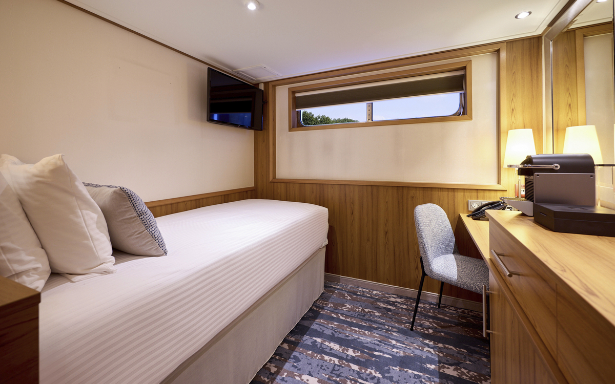 Die 1-Bettkabinen und die Suite sind in Ausstattung und Grösse identisch zu denen auf dem Oberdeck, jedoch besitzen auch diese ein Oberlichtfenster, das aus Sicherheitsgründen nicht zu öffnen ist, und eine Dusche.
