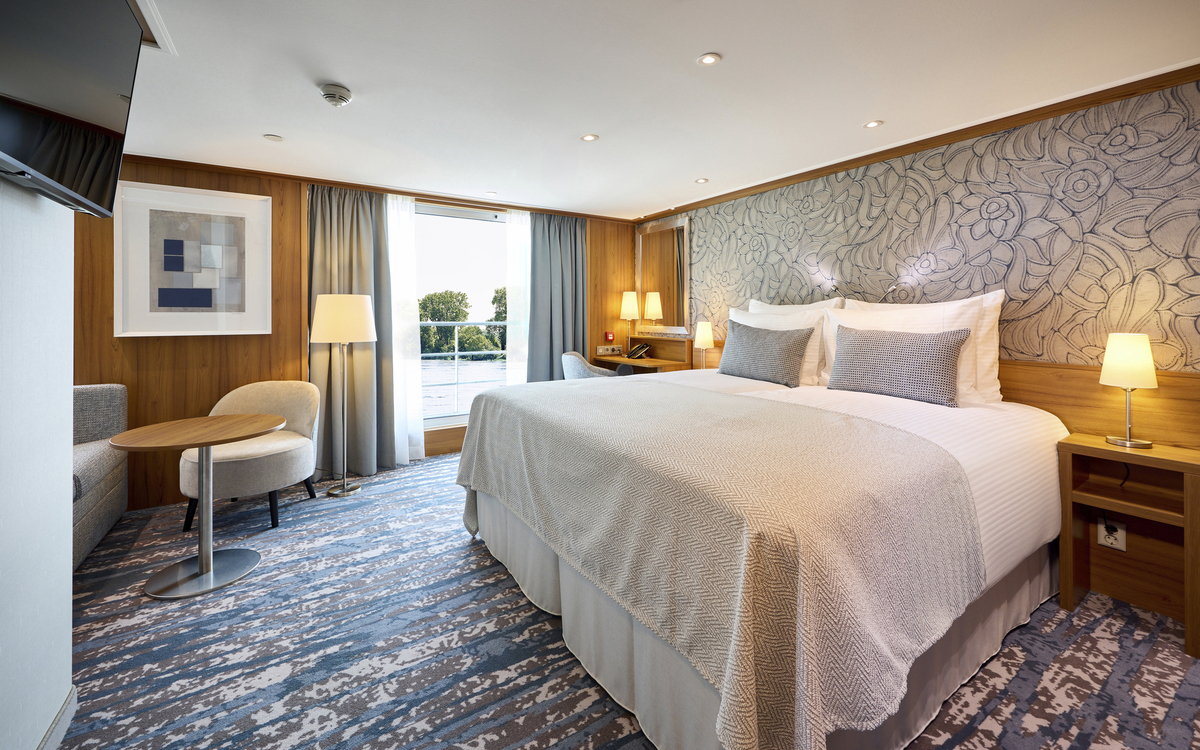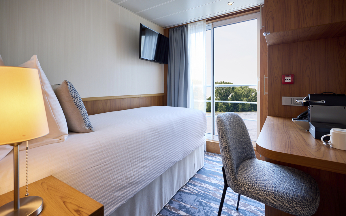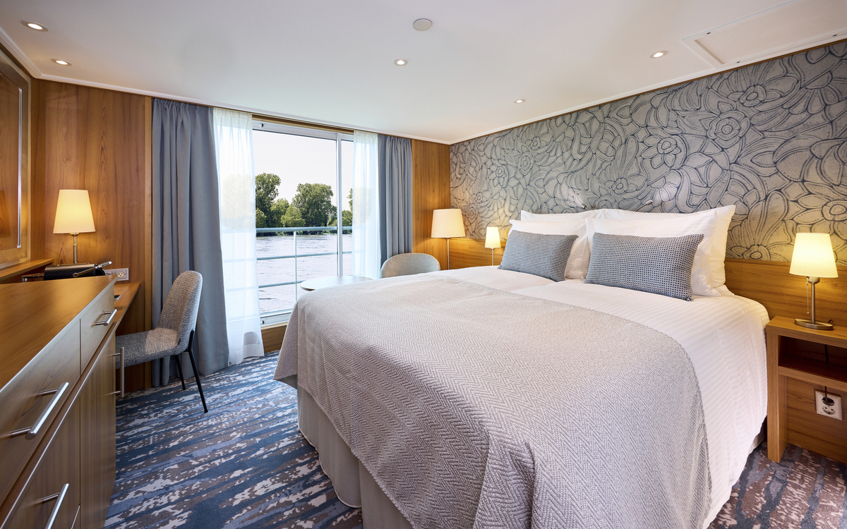 Die ca. 16 m² grossen 2-Bettkabinen des Mittel- bzw. Oberdecks verfügen über einen französischen Balkon mit raumhohen Glasschiebetüren.