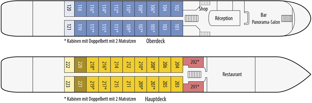 Zur Bordausstattung gehören Panorama-Salon mit Tanzfläche und Bar, Bordshop, Réception sowie ein kostenloser Wasserspender. Das Sonnendeck mit Sonnensegel, komfortablen Liegestühlen, Stühlen und Tischen lädt zum Verweilen ein. Gratis WLAN nach Verfügbarkeit. Nichtraucherschiff (Rauchen auf dem Sonnendeck erlaubt).