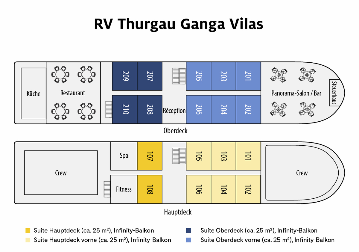 Die RV Thurgau Ganga Vilas wurde im modernen indischen Stil gebaut und mit regionalen Harthölzern, wertvollen Möbeln und landestypischen Bildern ausgestattet. Das Schiff überzeugt durch eine einzigartige, elegante Ausstattung. Die geringe Anzahl von max. 36 Gästen trägt zu einer ausserordentlich familiären Atmosphäre bei.