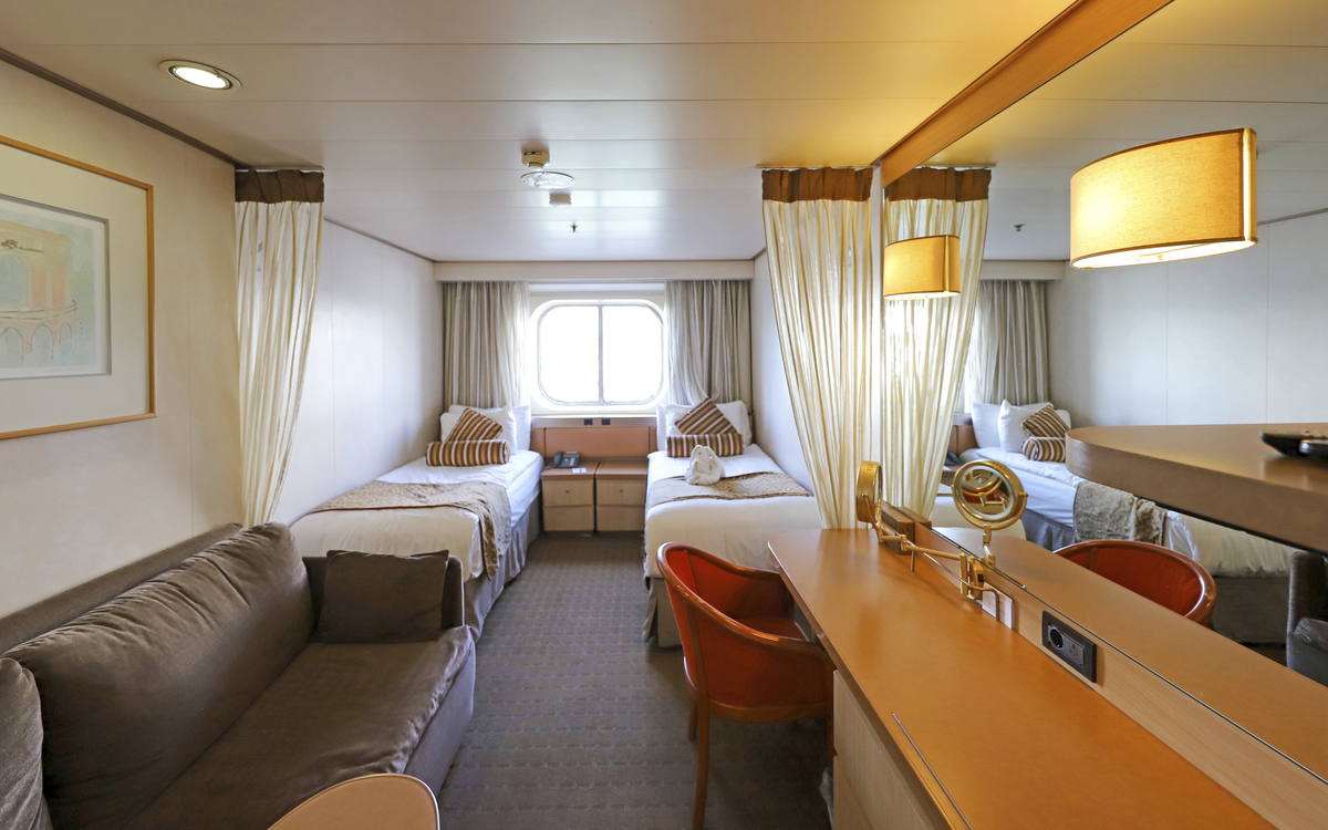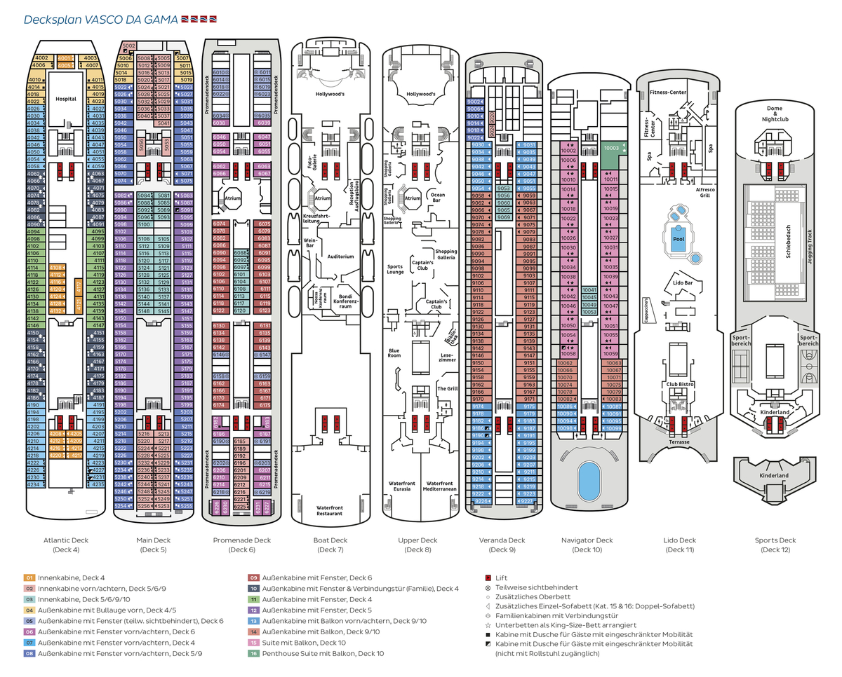 Familiäres Ambiente und geschmackvolles Design erwarten Sie an Bord der Vasco da Gama. Mit einer Kapazität von ca. 1000 Passagieren bleibt viel Raum für Ihr individuelles Kreuzfahrterlebnis. Das klas sischschöne Hochseeschiff bietet Ihnen eine grosse Auswahl unterschiedlicher Innen, Aussen, Familien und Balkonkabinen sowie Suiten. Die ca. 13 bis ca. 102 m² grossen Kabinen und Suiten bieten höchsten Wohlfühlfaktor und entspannte Atmosphäre. Sie sind mit Kleiderschrank, Dusche oder Badewanne, WC, individuell regulierbarer Klimaanlage/Heizung, Safe, Föhn und TV ausgestattet. Die Betten können auf Wunsch getrennt gestellt werden. Zur Bordausstattung gehören fünf Restaurants, sieben Bars und Cafès in unterschiedlichen Designs. Im ShowTheater «Hollywood’s» über zwei Decks bietet Ihnen das bordeigene ShowEnsemble erstklassige Abendunterhaltung. Platz für Entspannung oder sportliche Aktivitäten bieten der Wellnessbereich mit Sauna und Dampfbad, ein grosses FitnessCenter, Sportflächen auf den Aussendecks sowie zwei Pools, davon einer mit Glasschiebedach. Ein Lift verbindet alle Decks miteinander. WLAN gegen Gebühr, nach Verfügbarkeit. Nichtraucherschiff (Rauchen nur in gekennzeichneten Bereichen auf dem Aussendeck gestattet.) Das Schiff ist nicht barriere frei. Familien-Plus: Spezielle Aussenkabinen mit Fenster und Verbindungstür (Kategorie 10). Für Kinder ab 3 Jahren steht an Bord ein grosszügiger betreuter Spielbereich mit Innen und Aussen flächen, der sich über 2 Decks erstreckt, zur Verfügung.